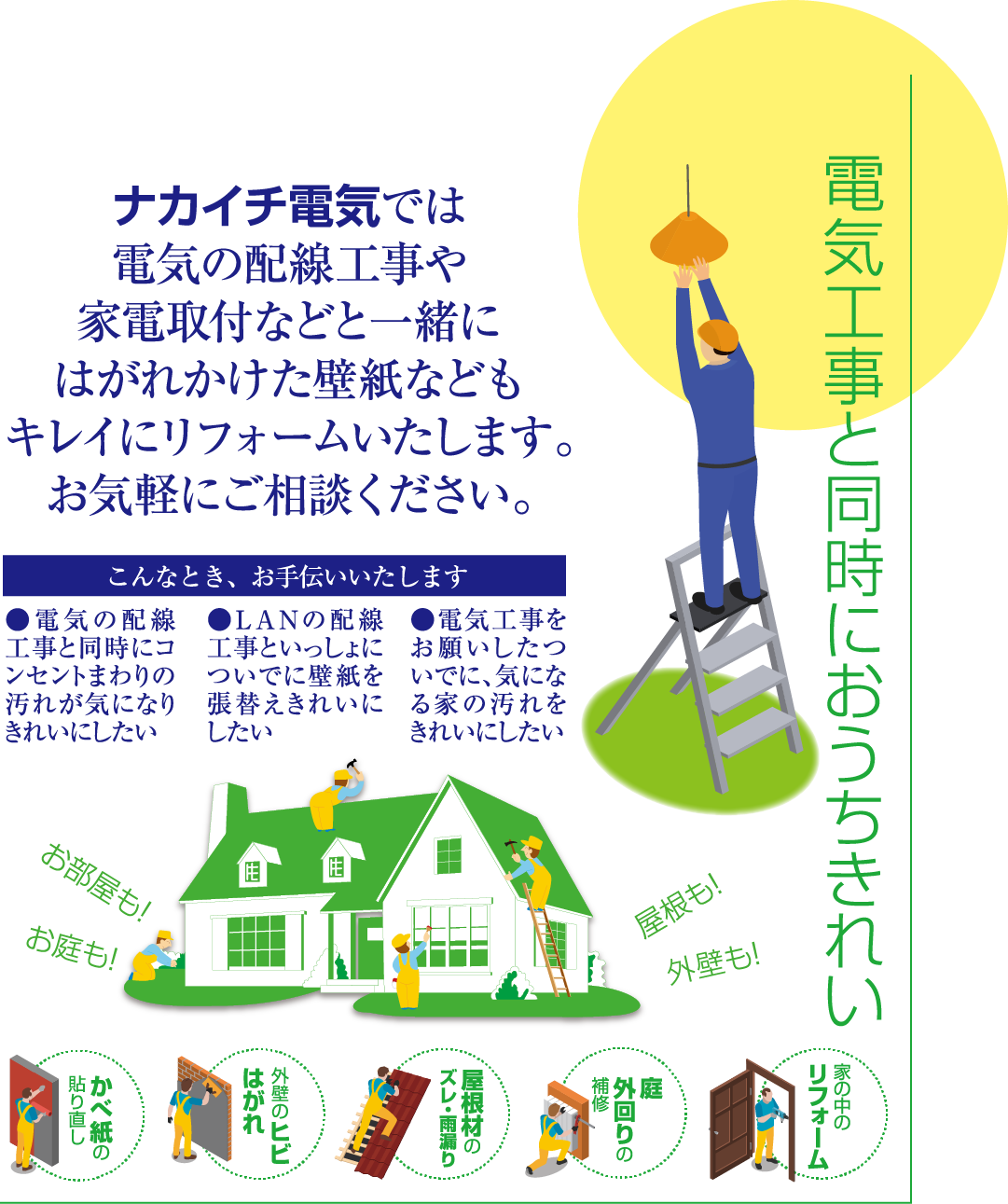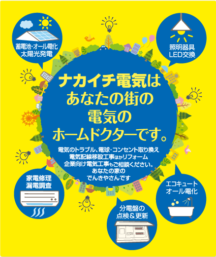 私たち中一電気工業では、「あなたの街の電気のホームドクター」として太陽光発電、蓄電池、オール電化、エコキュート、照明器具など新設施工から分電盤の点検・更新、家電修理、漏電調査などの修理・調査まで一般のお客様へのサービスをご提供しております。